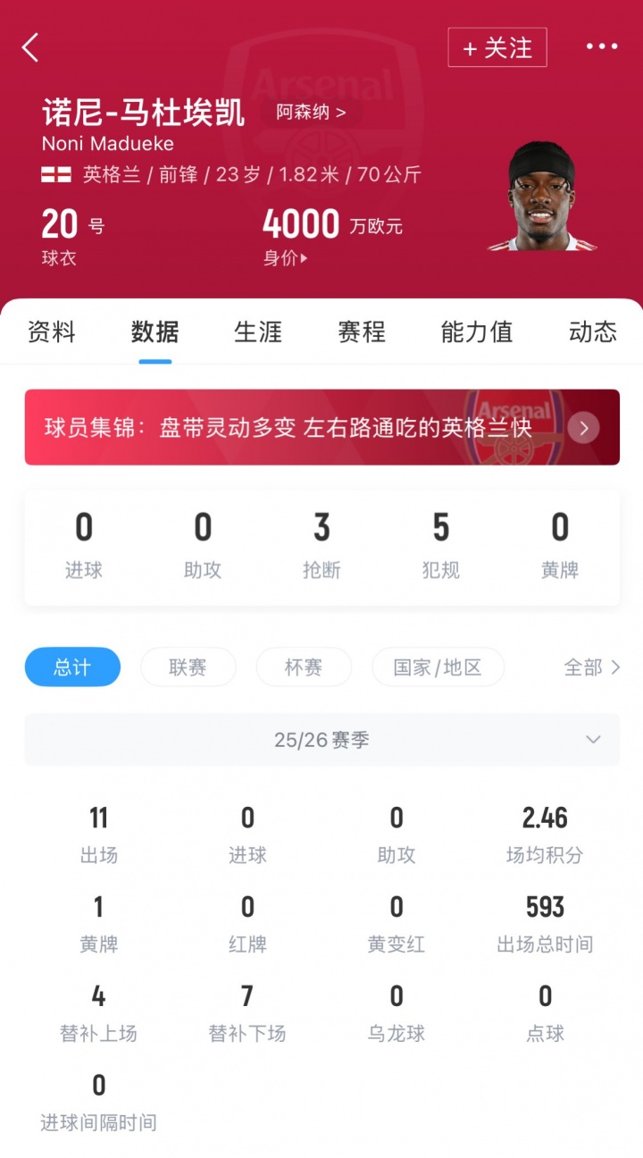 马杜埃凯本赛季代表阿森纳各项赛事出战了6场比赛,尚未收获进球和助攻。